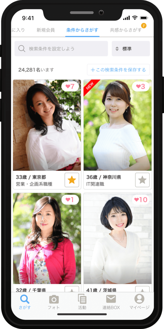 有料オプションとなってしまいますが、IBJSプレミアムパック限定機能がお勧めです。あなたの活動を分析し、マッチングの可能性が高いお相手を、”成立しやすい”タブに表示してくれます。マッチングの機能を使って、お相手を選別し、お一人お一人をじっくり見てみるのも婚活の近道ですね。